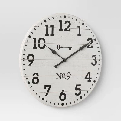 Keep track of time while adding rustic charm to your interiors with the Farmhouse Wood Wall Clock from Threshold™. This decorative wall clock features a slatted design with clear, black numerals on a white background to make it easy to read the time. Sporting a round silhouette, this analog wall clock features a slightly weathered design that adds a homey touch to your space, making it a functional accent piece for your conversation nook, entryway, kitchen or any other wall in your home.