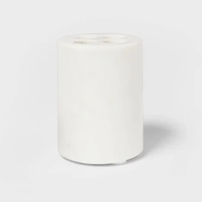Fill your daily routine with contemporary style with the 4pc Bath Coordinate Set Marble from Threshold™. This bathroom coordinate set includes a soap dish, a toothbrush holder with three-way partitioning, a lidded bath canister and a soap/lotion dispenser to bring organization to your space. Each piece in this bathroom accessories set is made from white marble to add visual interest to your bathroom counter.