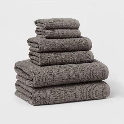 Elevate your bathroom decor with this 6-Piece Modern Towels and Washcloths Set from Threshold™. Made from heavyweight 100% terry cotton fabric, each towel in this set feels soft and allows you to dry off your hands in comfort. This set includes two bath towels, two hand towels, and two washcloths, each featuring a same geometric design on a solid background to add to your modern bathroom aesthetic.