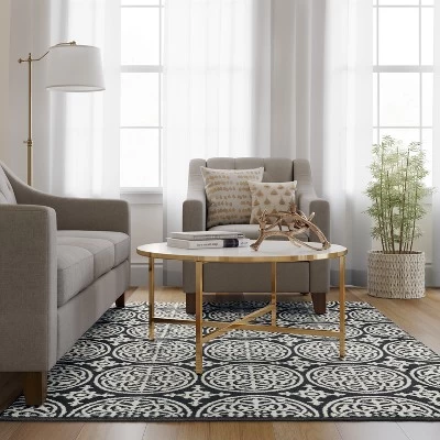 This Washable Tufted And Hooked Rug from Threshold™ is ideal for protecting the flooring in your entryway or hallway from foot traffic. This eye-catching, medallion-patterned rug’s intricate designs will provide a visual focal point for any room, while its tufted, hooked weave adds textural interest. Plus, the latex backing helps keep the rug from sliding around your floors. Constructed with stain-resistant materials to keep it looking new for longer, this machine-washable rug is easy to clean and maintain.