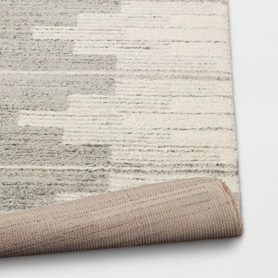 This Modern Lines Area Rug from Threshold™ will create a wonderful foundation in any room. The area rug is adorned with cream bar-chart-like stripes on the two sides with a light gray textured center to add a touch of modern elegance to your space. This rectangular rug has a loomed, medium-pile construction that provides soft comfort underfoot while adding warmth to hard flooring like tile, and it suits both transitional and modern decors.