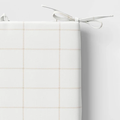 Fill your outdoor seating space with comfort and style with this Woven Grid Outdoor Seat Cushion from Threshold™. Made from a water-repellent fabric to withstand the elements, this outdoor seat cushion features a soft fill for comfortable seating. The back ties allow you to secure it to your outdoor chair frame, while the removable cover makes it easy to clean. Showcasing a woven grid pattern on a solid background, it’s sure to add a touch of modern style to your outdoor seating space. Scotchgard™ Protection is specially formulated with sustainability in mind. They can stand up to the wettest conditions and they’re carefully designed to repel and resist nearly all water based stains.